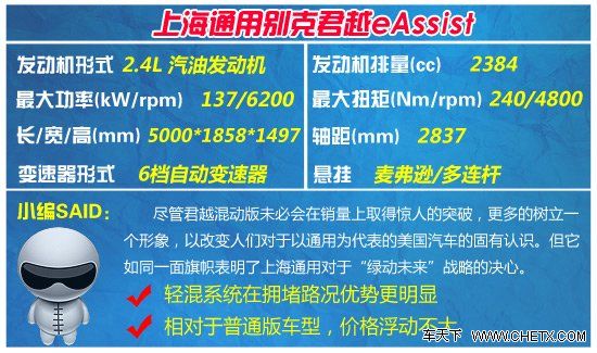 君越eAssist将2.4LSIDI智能直喷发动机与eAssist智能混合动力技术完美结合,包括专用6速手自一体变速箱、15kW电动机、115V高性能锂电池、智能降阻进气格栅、底盘空气动力学优化、低滚阻绿色轮胎等亮点设计。