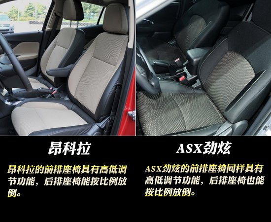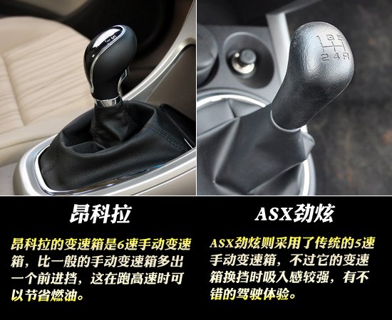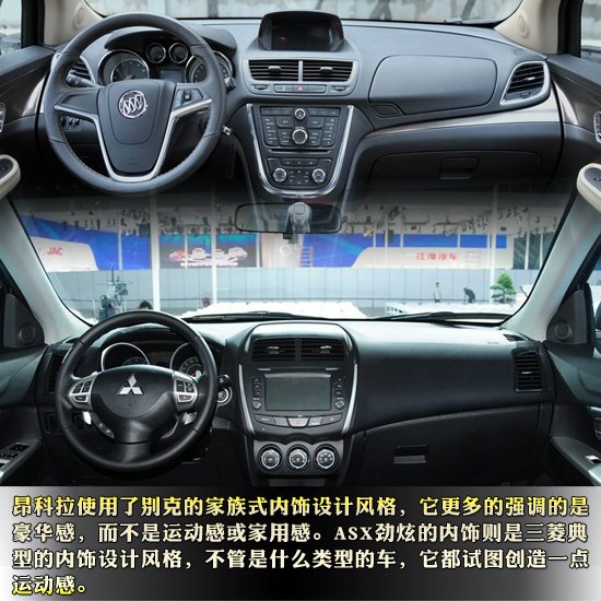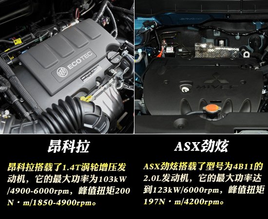 昂科拉是一款全新车型,它全系都搭载1.4T发动机,并有6速手动和6速手自一体变速箱与之搭配,在空间方面,它与逍客差不多。而ASX劲炫搭载高功率版本的1.6L和2.0L自然吸气发动机,搭载5速手动变速箱和CVT变速箱,它本是与途观(报价 参数 图片 论坛)(报价 参数 图片 论坛)一个级别的城市SUV,但现在价格却下探到紧凑级SUV级别,所以它在空间上有一定优势。因为它们都是以性价比著称,所以笔者选取了价格为14.99万元(报价 参数 图片 论坛)的昂科拉ENCORE(报价 参数 图片 论坛)(报价 参数 图片 论坛)2013款1.4T手动两驱进取型和价格14.88万元的ASX劲炫2013款2.0L手动两驱舒适版进行对比。