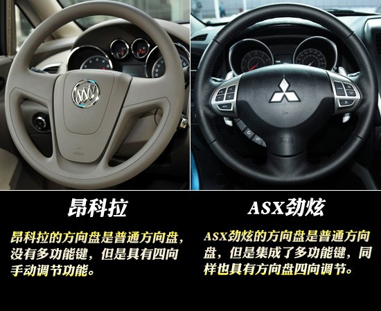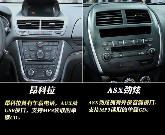 在方向盘方面,昂科拉的方向盘是普通方向盘,没有多功能键,但是具有四向手动调节功能。ASX劲炫的方向盘是普通方向盘,但是集成了多功能键,同样也具有方向盘四向调节。在这方面,又是ASX劲炫做的更好。在多媒体配置方面,昂科拉具有车载电话,AUX及USB接口,支持MP3读取的单碟CD。ASX劲炫拥有外接音源接口,支持MP3读取的单碟CD。既然是入门车型,在多媒体娱乐方面我们不能要求太多。