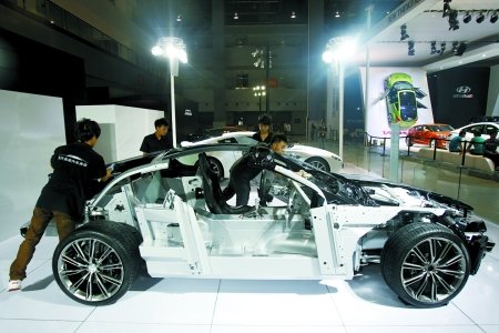 在展会四楼,记者发现一辆汽车正“匍匐”在约75°斜角的墙上。“我们这样摆设,就是为了让消费者看清,这款车只有三个门。”现代汽车(中国)整车销售本部经理李美兰表示,这款汽车是针对个性青年设计,其前排有两个门,后排只有一个门。李美兰称,该车是使用钢架固定在展板上,然后通过拖车将展板拉到与水平面呈75°角,最终在墙上展示了这款汽车。