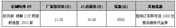 车天下汽车网编辑从重庆长城轻舟4S店处获悉,H5绿静2.0T手动两驱舒适版(2011款)优惠9000(报价 参数 图片 论坛),车展限量5台,数量有限,先订先得。现场订车即可送1000元售后维修代金券。 具体优惠如下: