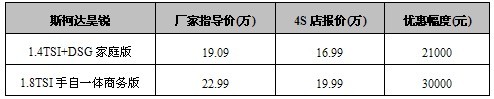 编辑从重庆上海大众斯柯达璟锐4S店处了解到,重庆车展期间,昊锐(报价 参数 图片 论坛)推出系列优惠,最高幅度达3万(报价 参数 图片 论坛)。具体优惠如下: