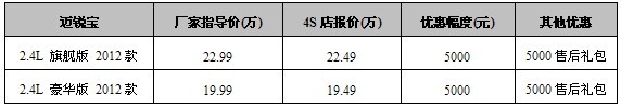 车天下汽车网编辑从重庆上海通用雪佛兰中豪4S店处获悉,车展期间购买迈锐宝(报价 参数 图片 论坛)2.4L,享5000(报价 参数 图片 论坛)优惠,送5000元售后礼包。具体优惠如下: