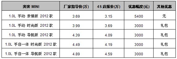 车天下汽车网编辑从重庆长安轿车万州翔嘉4S店处获悉,现店内长安奔奔MINI(报价 参数 图片 论坛)全系现金优惠5400(报价 参数 图片 论坛),现车充足。具体优惠如下表: