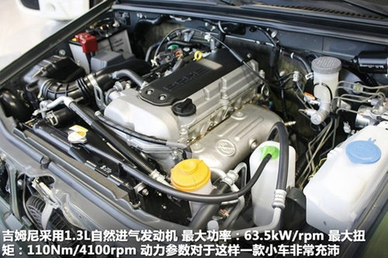 吉姆尼的动力源于铃木运转平稳的M13ADOHC发动机,配合四轮驱动驾驶模式,面对任何艰难险阻都能所向披靡。该款发动机采用全铝材料,具有重量轻、燃油效率高的特点。其动力和先进技术还体现在换档平稳的4速自动或5速手动变速器上;通过设计独特的链条,在降低噪音和减少摩擦的同时还减少了功率损耗。在高速行驶时,变速器机械锁止装置可提高燃油经济性。