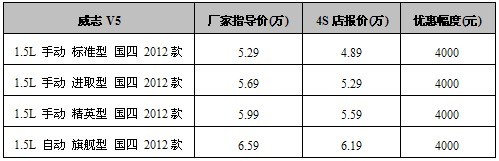 车天下汽车网编辑从重庆天津一汽神行达4S店处获悉,店内2012款威志V5(报价 参数 图片 论坛)现车有售,购车可享受4000(报价 参数 图片 论坛)优惠。具体优惠如下表:
