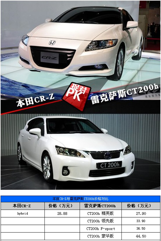 是的,今天笔者就为大家选择了两款售价接近30万元的精品小车,它们分别是售价28.88万元的本田CR-Z2012款hybrid和雷克萨斯CT(报价 参数 图片 论坛)200h2012款精英版。虽然本田CR-Z是被定位于一款跑车和雷克萨斯CT200h的紧凑型车有所区别,但是仅从混合动力方面以及同样充满个性十足的种种特色,两款车都可以一较高下。
