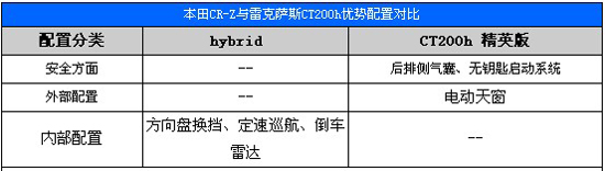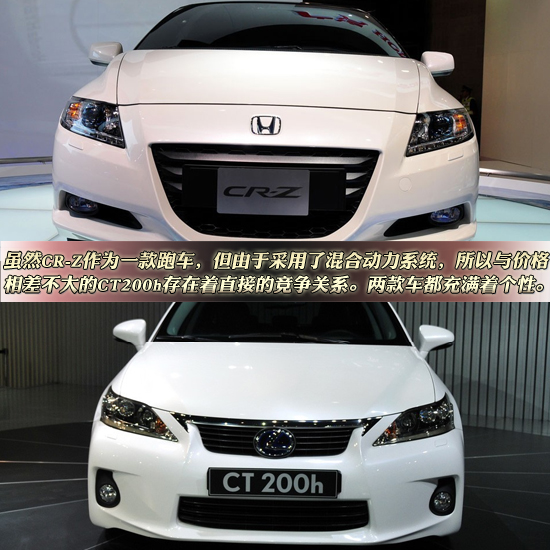 虽然本田CR-Z作为一款跑车,但由于采用了混合动力系统,所以与价格相差不大的雷克萨斯CT200h存在着直接的竞争关系。两款车都充满着个性与独特。