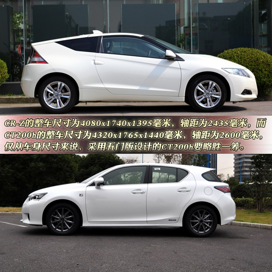 本田CR-Z的整车尺寸为4080mm*1740mm*1395mm,轴距为2435mm,而雷克萨斯CT200h的整车尺寸为4320mm*1765mm*1440mm,轴距为2600mm,仅从车身尺寸来说,采用五门版设计的雷克萨斯CT200h要略胜一筹。虽然两款车都身材短小,但不意味着在安全性能方面会有所缺失,只要你遵守交通规则,一切都会使妥妥的。