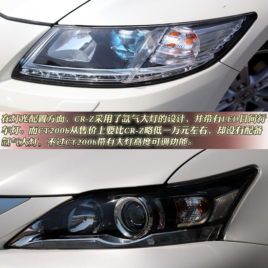在灯光配置方面,本田CR-Z采用了氙气大灯的设计,并带有LED日间行车灯。而雷克萨斯CT200h从售价上要比本田CR-Z略低一万元左右,却没有配备氙气大灯,不过雷克萨斯CT200h带有大灯高度可调功能以及日间行车灯。