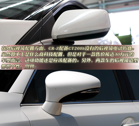 在外后视镜配置方面,本田CR-Z配备了雷克萨斯CT200h没有的后视镜电动折叠,虽然这算不上是什么高科技配置,但是对于一款售价接近30万元的车型而言,这项功能还是应该配备的。另外,从造型方面来讲,两款车的后视镜都显得很个性,别致。