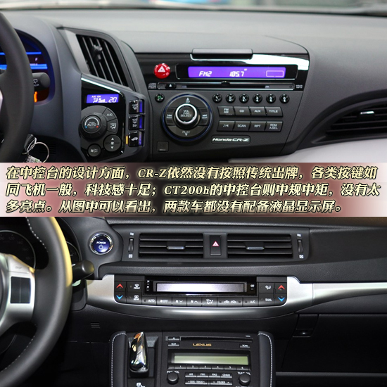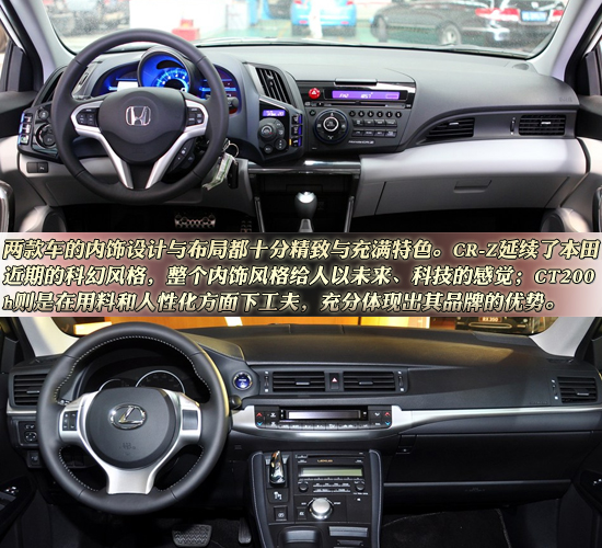 两款车的内饰设计与布局都十分精致,充满特色。本田CR-Z延续了本田近期的科幻风格,整个内饰风格给人以未来、科技的感觉。从图中我们也看出,本田CR-Z有着非常炫目的仪表盘,让人看着赏心悦目;雷克萨斯CT(报价 参数 图片 论坛)200h则是在用料和人性化方面下功夫,充分体现出其品牌的优势。