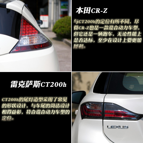本田CR-Z与雷克萨斯CT200h的定位有所不同,尽管CR-Z也是一款混合动力车型,但它同时还是一辆跑车,无论从性能上是否达到跑车应有的要求和标准,至少在设计上要更加犀利;而雷克萨斯CT200h的尾灯造型采用了常见的形状设计,与车尾的简洁设计相得益彰,符合混合动力车型的定位。