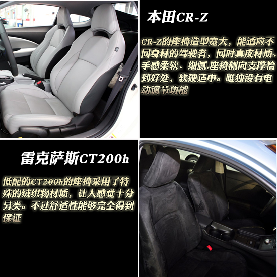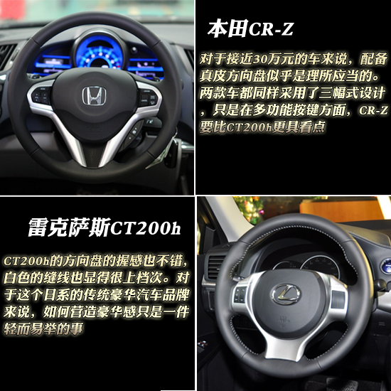 对于接近30万元的车来说,配备真皮方向盘似乎是理所应当的。两款车都同样采用了三幅式设计,只是在多功能按键方面,本田CR-Z要比雷克萨斯CT200h更具看点和功能强大;雷克萨斯CT200h的方向盘的握感也十分不错,白色的缝线显得很上档次。对于这个日系的传统豪华汽车品牌来说,如何营造豪华感只是一件轻而易举的事。