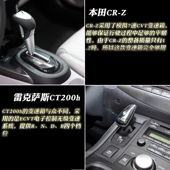 本田CR-Z采用了模拟7速CVT变速箱,能够保证行驶过程中足够的平顺性,由于本田CR-Z的整备质量只有1.2吨,所以这款变速箱完全够用了;雷克萨斯CT200h的变速箱与众不同,采用的是ECVT电子控制无级变速系统,提供R、N、D、B四个挡位。从造型上,雷克萨斯CT200h的变速箱也显得很精致,像一件别致的艺术品一般。至于是否操作便利,相信熟悉之后,还是能够适应的。
