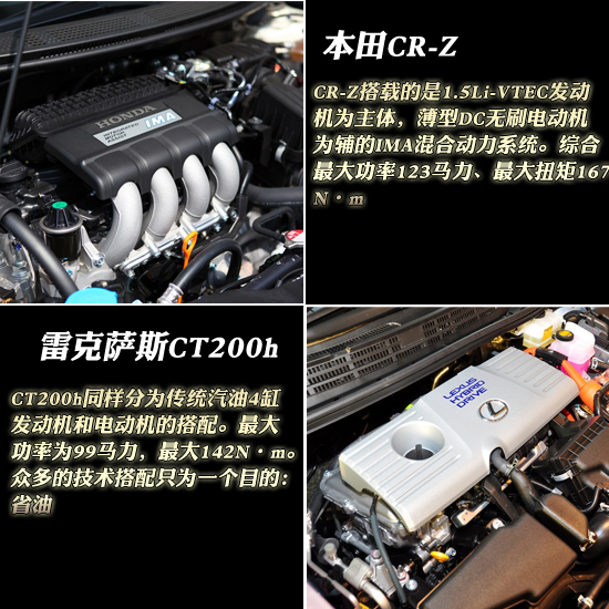 在动力性能方面,本田CR-Z搭载的是1.5Li-VTEC发动机为主体,薄型DC无刷电动机为辅的IMA混合动力系统。综合最大功率123马力、最大扭矩167N·m;雷克萨斯CT200h的动力系统同样分为传统汽油4缸发动机和电动机的搭配。最大功率为99马力,最大142N·m。众多的技术搭配只为一个目的:省油!