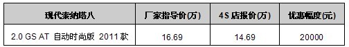 车天下汽车网编辑从重庆北京现代沛鑫4S店处获悉,目前购买第八代索纳塔(报价 参数 图片 论坛) 2011款 2.0 GS AT 自动时尚版,车价直降2万(报价 参数 图片 论坛)。具体优惠如下表: