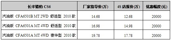 车天下汽车网编辑从重庆猎豹耀奇4S店处获悉,即日起,凡是到店购买猎豹CS6(报价 参数 图片 论坛)即可享受2万(报价 参数 图片 论坛)现金优惠。具体优惠如下表: