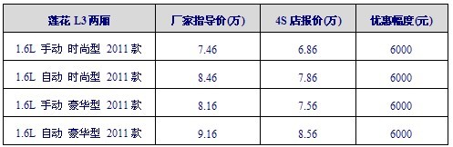 [导读] 车天下汽车网编辑从重庆莲花捷鹏4S店处获悉,目前购莲花L3两厢车型,享现金优惠6000元。