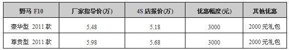 车天下汽车网编辑从重庆野马(报价 参数 图片 论坛)丰易工贸4S店获悉,目前购11款野马F10(报价 参数 图片 论坛),享3000(报价 参数 图片 论坛)现金优惠及2000元礼包。详情如下表: