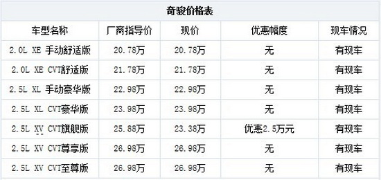 近日,车天下重庆分站编辑从东风日产重庆东风南方渝兴4S店了解到,目前,该店店内有奇骏(报价 参数 图片 论坛)现车销售,即日起,凡是在该店店内购奇骏指定款,最高可享受现金优惠2.5万(报价 参数 图片 论坛)!有意近期购买日产奇骏的朋友不妨亲自到店去看看!具体情况请详询经销商!