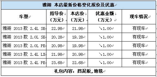 陈家坪商社广本新亚店2013款雅阁现车销售,颜色可选,目前购车部分车型可优惠1万元,感兴趣的朋友可以到店咨询购买,详情见下表: