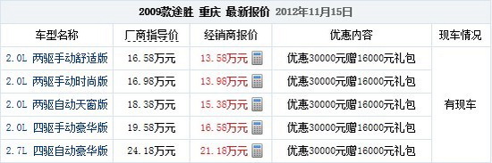 近日,车天下汽车网重庆分站编辑从北京现代汽车美源特约销售服务店获悉,目前该店店内2009款途胜(报价 参数 图片 论坛)有现车充足销售,购车可享受3万(报价 参数 图片 论坛)优惠,购部分车型将获赠1.6万元礼包!有意愿近期购买北京现代途胜的朋友不妨亲自到店看看或致电经销商详询!