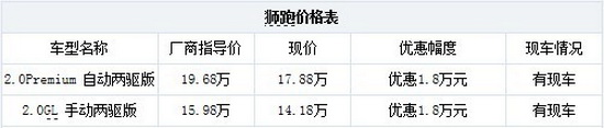[导读] 昨日,车天下汽车网重庆分站编辑从重庆商社启迪汽车销售服务有限公司获悉,目前,该店店内2012款狮跑现车充足销售,购车可享最高现金优惠1.8万元,部分车型将获赠1万元礼包!有意愿近期入手起亚狮跑的朋友不妨亲自到店看看或致电详询经销商!起亚狮跑车型简介:底盘都有轿车化的趋势,新狮跑也改变了老款狮跑采用的h大梁结构及硬轴后桥的设计,采用的是一体化承载式车身和四轮独立悬挂的轿车化设计。