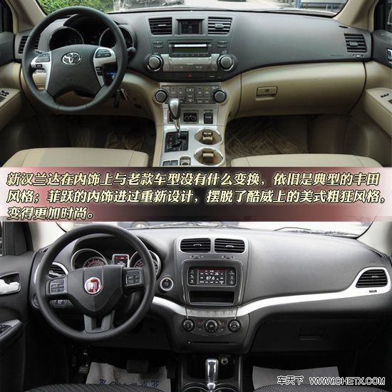 新汉兰达(报价 参数 图片 论坛)(报价 参数 图片 论坛)在内饰上与老款车型没有什么变换,依旧是典型的丰田风格。色调以米色和黑色为主,真皮和银色饰板的组合给人一种轻松愉悦的感受。菲跃(报价 参数 图片 论坛)(报价 参数 图片 论坛)内饰简洁、时尚,在内饰配色上,舒适型只提供黑色这一种配色方案,而豪华型除了黑色外则还能选择棕色的内饰,看起来很有质感。