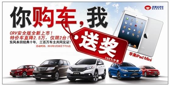 2013年30日百事达东风本田4S店不但迎来了“东风HONDA经典十年,三百万车主共同见证!”还迎来了“百事达东本3月超值购车季,你购车我送奖(100%中奖),海量iPad Mini送不停!!”双重好礼送不停,是您买车和看车的最佳时间,千万不要错过!为了答谢新老客户特别推出两款特价车,买完为止。活动热线:023-86392888!