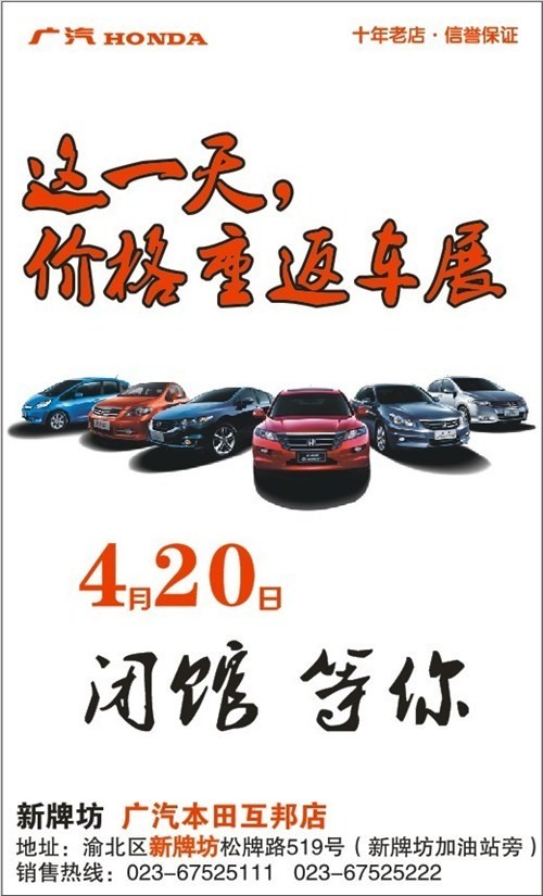 新牌坊广本互邦店为回馈广大朋友对本店的支持与关注,特在本周六(4月20日)举办广本全系车型闭馆销售,雅阁(报价 参数 图片 论坛)2013款最高优惠5万,报价仅售16.98万起;歌诗图(报价 参数 图片 论坛)最高优惠2万5;锋范(报价 参数 图片 论坛)8折起;这一天,价格重返车展,今年以来最大幅度现金优惠,全系车型实际现金优惠幅度远大于网络报价,活动期间购车的还可享受厂家3000(报价 参数 图片 论坛)感恩补贴。活动当日,全系车型免去砍价环节,全部抄底优惠,总经理亲临现场签售。感兴趣的朋友敬请来电咨询:023-67525111,6752522。