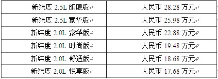 新纬度此次共推出6个版本的车型,官方建议市场零售价分别为: